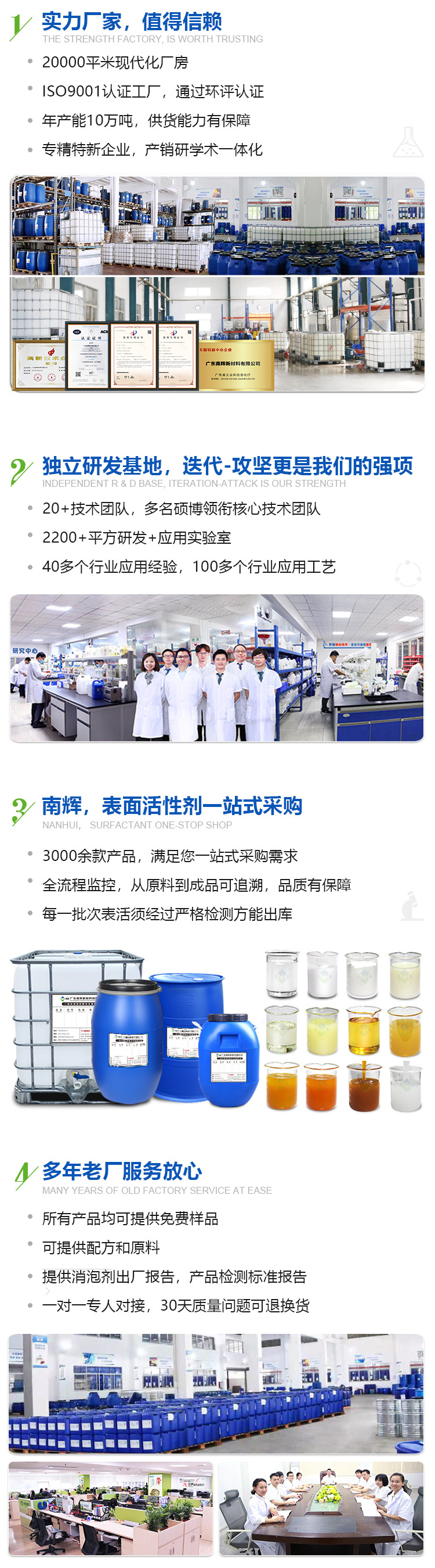 廣東南輝新材料有限公司,是一家致力于表面活性劑研發(fā)、生產(chǎn)、銷售為一體的國家高新技術企業(yè),擁有獨立的研發(fā)基地,主要研發(fā)產(chǎn)品有:乳化劑、滲透劑、勻染劑、司盤、吐溫、消泡劑等3000余款產(chǎn)品。南輝擁有20000平方米的現(xiàn)代化生產(chǎn)車間,年產(chǎn)能可達10萬噸。通過ISO9001:2015質量管理體系認證,已獲得十余項不同產(chǎn)品的發(fā)明專利授權,被評為廣東省"專精特新"企業(yè)。從2018年開始批量出口至俄羅斯、日本、馬來西亞、印度、秘魯?shù)葒遥殉蔀閲鴥饶壳爸饕谋砻婊钚詣┥a(chǎn)廠家。